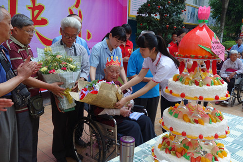 5月10日上午,我院联合怡然志愿者协会和好利蛋糕举办了一次特殊的生日会,为我院护理区吴济高老人庆祝100岁的寿辰。老人的子女专程从外地赶回参加老人的庆生会,大家为寿星送上鲜花,志愿者、南充十中的同学及我院老人、职工表演了精彩的歌曲和舞蹈表达祝贺,好利蛋糕为活动赞助了四层生日蛋糕。