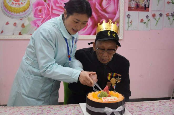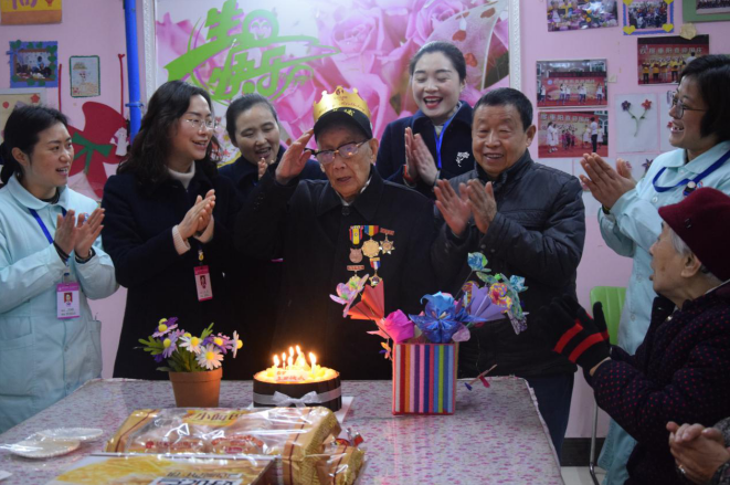 1920年1月8日出生的谢增华爷爷是一位参加过抗日战争的老兵,胸前佩戴的功勋章既是他过往光辉岁月的印记,也是我们来之不易幸福生活的见证。生日会上,大家齐唱“生日快乐”歌为老寿星送上祝福。谢爷爷颤颤巍巍地举起右手,以标准军礼向大家致敬,并激动地说道:“感谢党和政府,感谢福利院,感谢大家对我的关心和照顾,让我可以安享晚年,还能热热闹闹地度过百岁生日。”