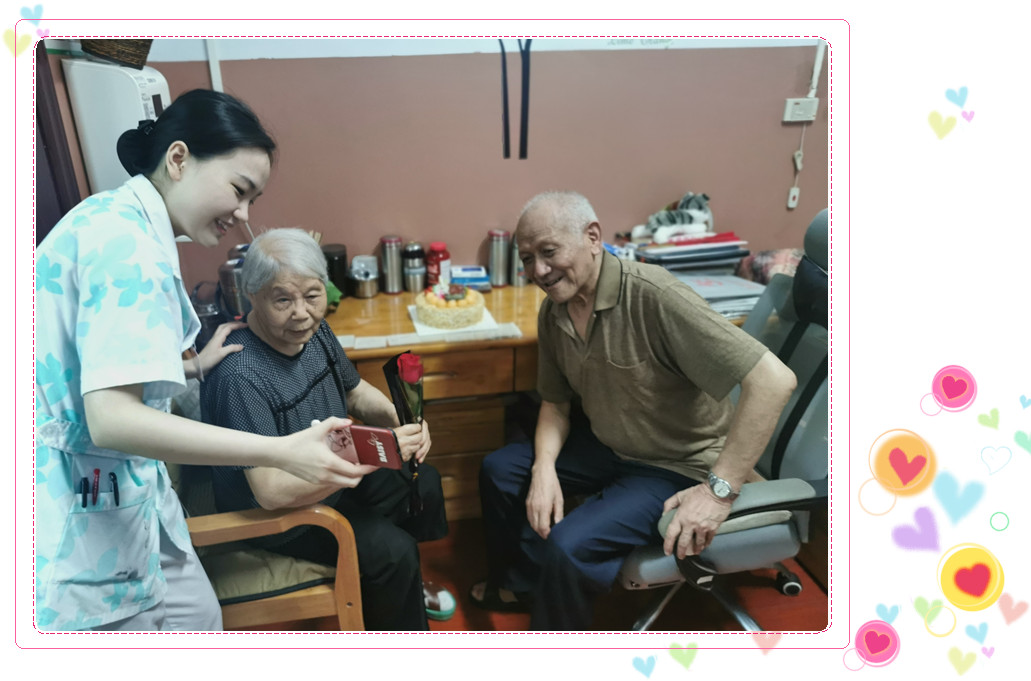 6月16日下午,天气晴朗,艳阳高照,伴随着轻快的生日祝福歌声,休养区张大爷手捧生日蛋糕在工作人员的陪同下走进310房间,对着本月寿星唐婆婆诚恳而又略带羞涩地说:“老婆子,今年是我们结婚的第65年啦!今天是你的生日,祝你身体健康、生日快乐,以后的路,我们相互扶持,共度余生,我爱你!”