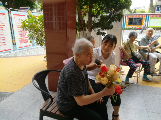 上午9点半,花园里传来阵阵掌声和笑声。爷爷奶奶们围成圈坐着,他们正在玩“击鼓传花”游戏。随着音乐节拍,花束在老人手中不停传递,音乐停下时,花在谁手里,谁就必须表演节目。“五月五、过端午,赛龙舟、敲锣鼓,包粽子、挂菖蒲,驱鬼邪、悼屈原,端午习俗传千古…… ”这一轮张爷爷为大家背诵了儿时有趣的端午童谣。击鼓传花游戏中还穿插了抢答环节,“屈原是我国春秋时期哪国人?”“楚国。”所有题目都围绕端午节的常识和习俗,通过抢答使端午的节日内涵更加深入人心。