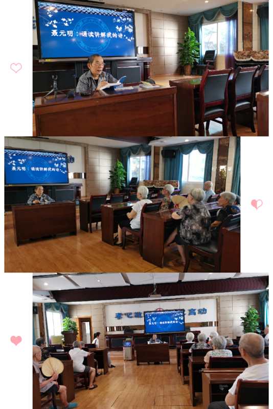 为全面践行单位“爱心福院,温馨家园”的办院理念,工作人员特地为老人策划开展了一次“诵读讲解我的诗”分享活动,邀请了喜爱文学的入住老人参加。分享会上,聂爷爷讲解了自己创作的心路历程,津津有味地诵读了自己的诗词,台下老人聚精会神地凝听,仿佛穿越进入了诗境。