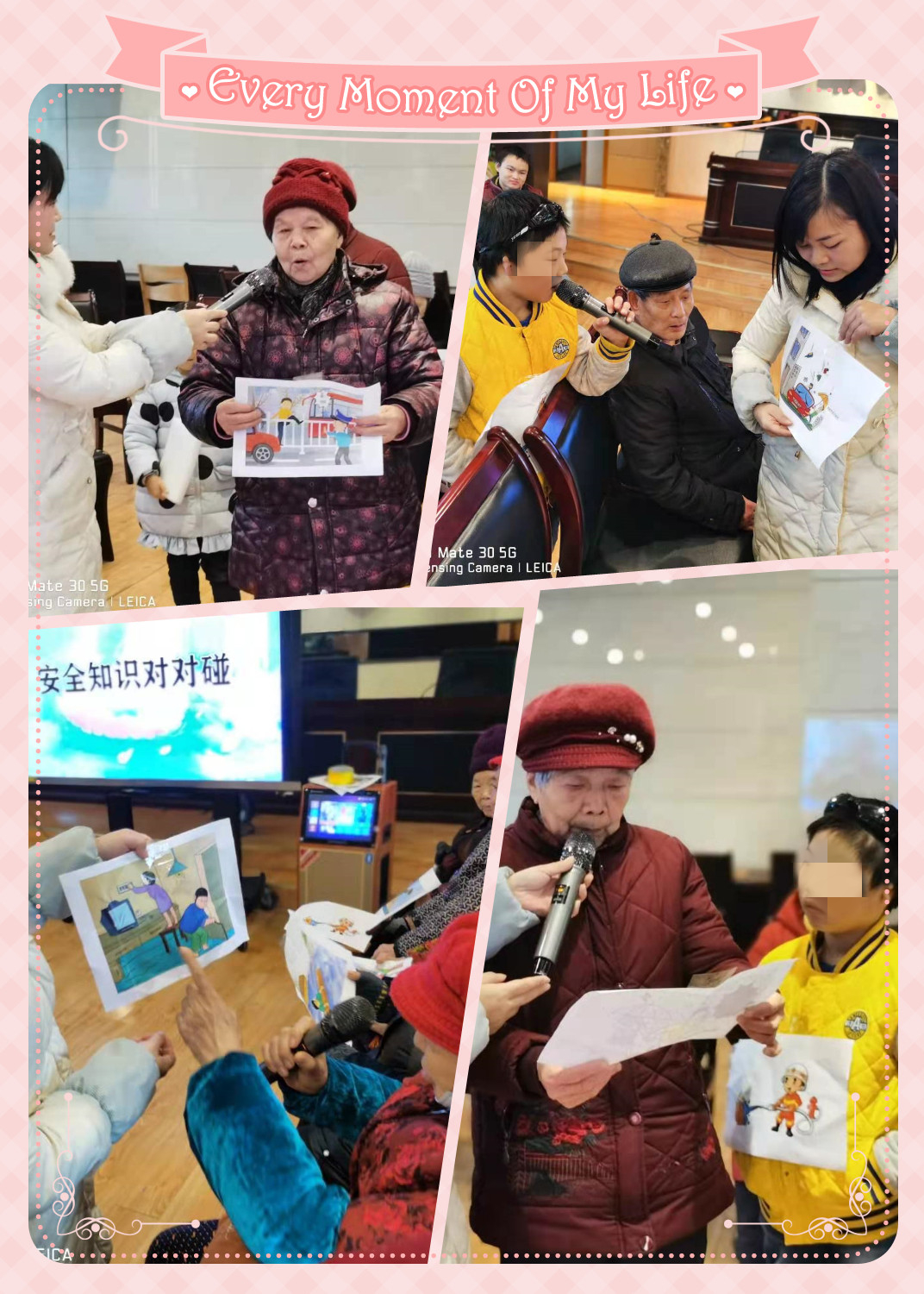 游戏开始后,长者和孩子们都“马不停蹄”地跑去找自己的同伴,活动现场,热闹非凡,笑声不断。在社工的“3、2、1”倒计时中,游戏停止,未找到同伴的长者和孩子为大家一一表演节目,并送上了他们最真挚的节日祝福。随后,在场每一位参与者都认真地向大家讲解了自己手中的安全知识图片内容及意外来临时的注意事项。活动进入尾声时,“辞旧迎新”接龙游戏登场,社工引导大伙儿用“新”字接龙的方式表达自己对 2021年的期许和愿景。
