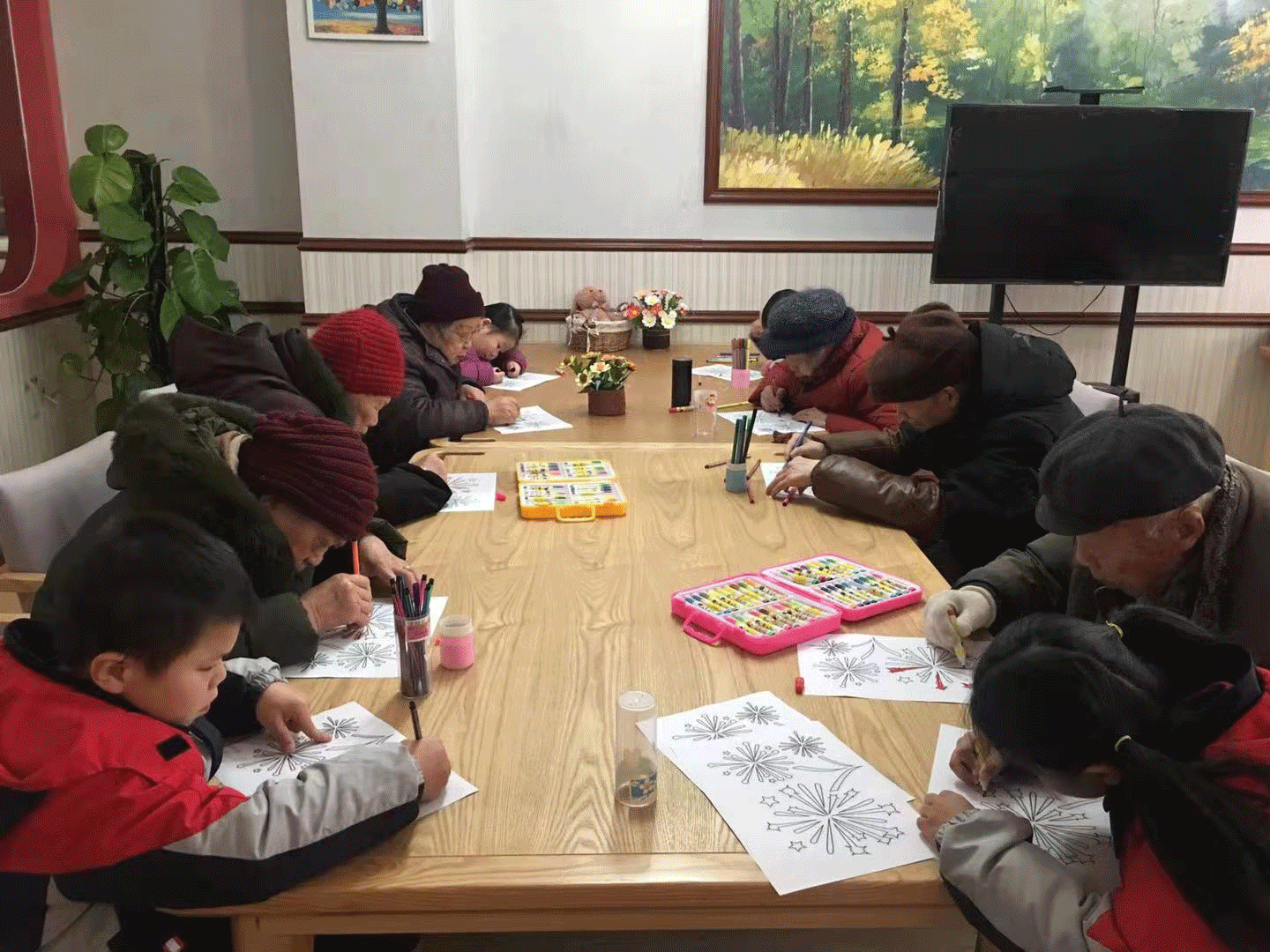 “一个小孩脾气暴,遇火他就往上跳,跳到半空不见了,一群小孩哈哈笑。”第一天的活动“绚丽烟花”在有趣的谜语中拉开了帷幕,工作人员向长者与儿童分发画纸和水彩笔:“小朋友和婆婆爷爷们,现在可以选自己最喜欢的颜色,给烟花穿上漂亮衣服,快乐过年。”老师一步步解说,长者和儿童跟着老师的步骤,各自创作自己的作品。“我要给它穿红色的衣服,代表新的一年红红火火。”罗婆婆边画边说。王婆婆和她的小伙伴讨论哪个颜色更好看。创意烟花在大家的奇思妙想中很快完成,大家互相欣赏彼此的作品。