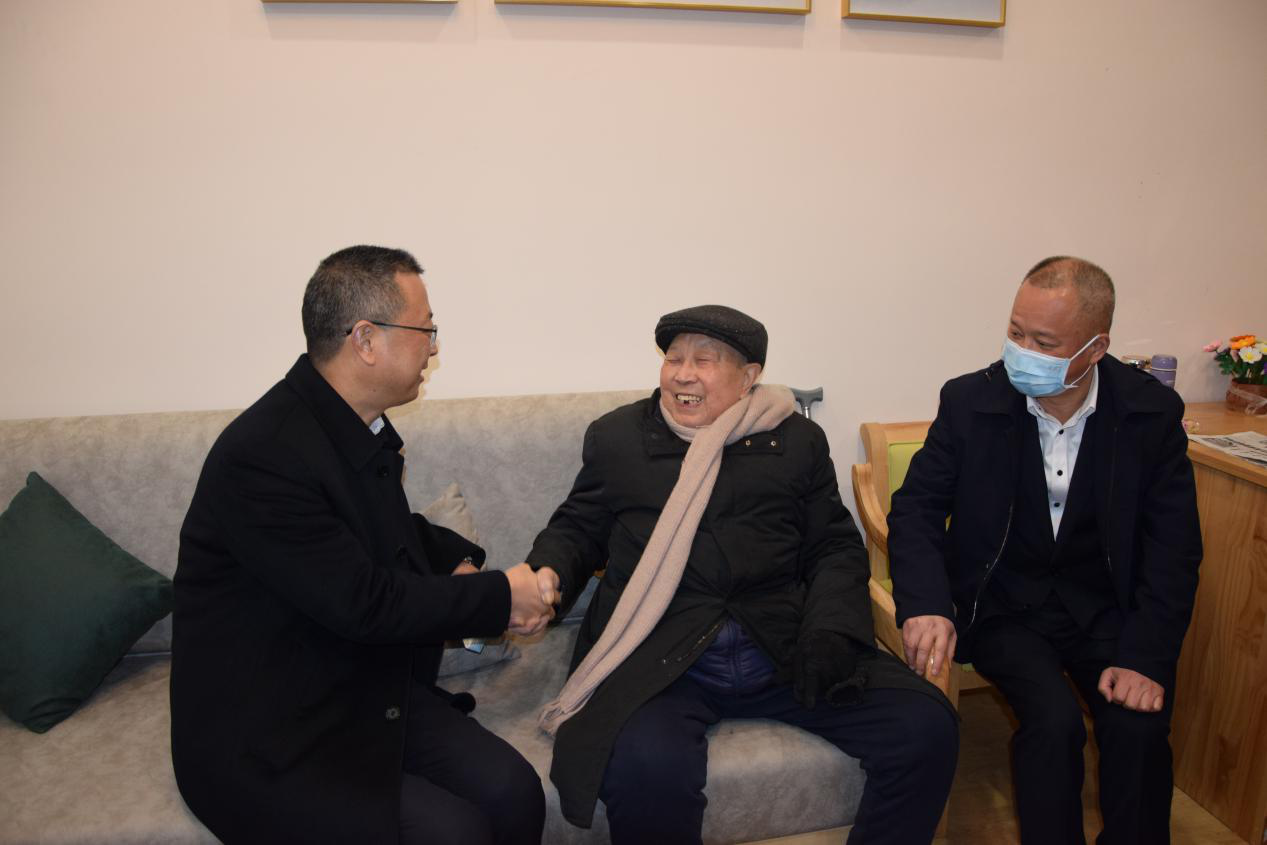 沈市长(左一)看望入住我中心新院区的原南充地区专员冯希尧(中),市民政局长李斌(右一)陪同看望。