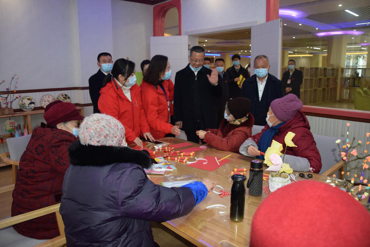 在儿童区调研后,沈市长一行又来到老年区,察看了怀旧、祈福、手工制作、阅览、书画、党建活动区和厨艺及生态体验区等功能区。他深入老人居室,同他们亲切交谈,了解他们的生活状况。在原南充地区专员冯希尧居室,他向老领导送上新年的祝福,叮嘱他一定要保重身体,继续为党为国发挥余热。