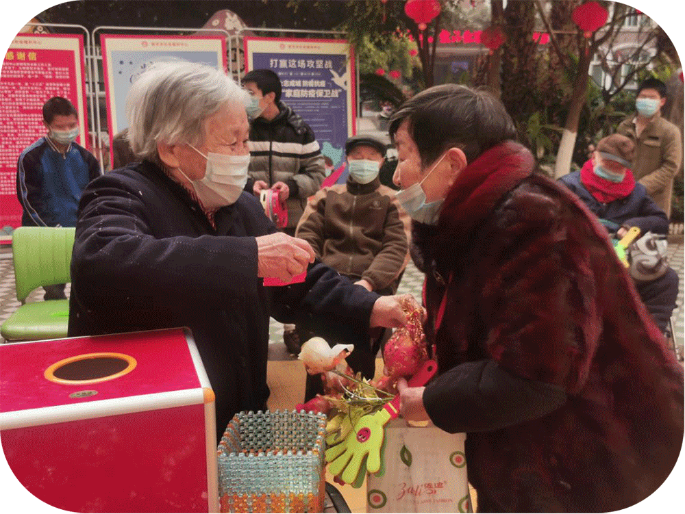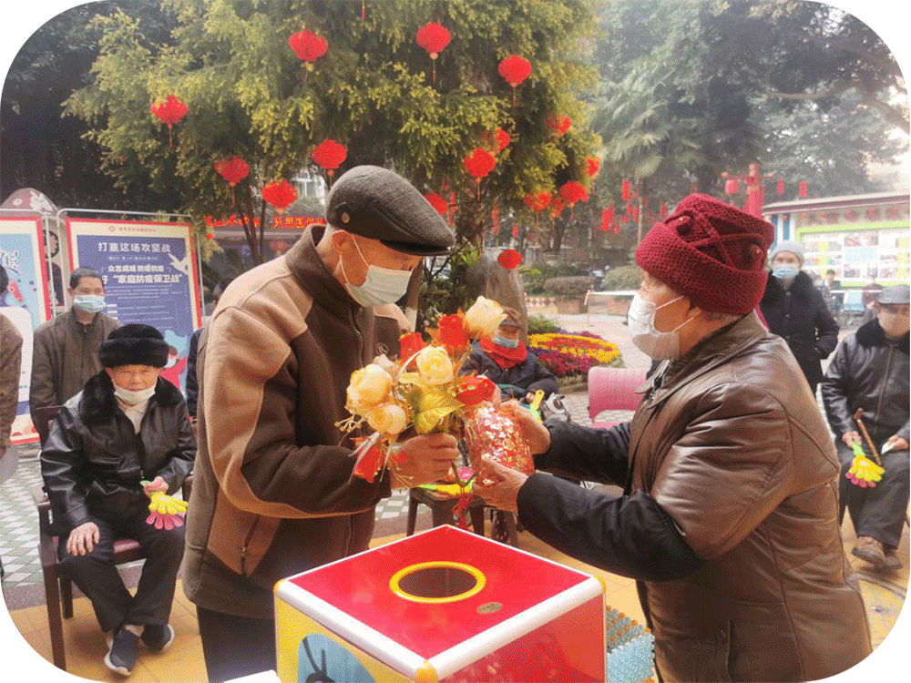 第二环节是老人相互拜新年。少儿拜新年之后,手持花束的老人将会在事先准备好的序号盒内任意抽一张序号卡片,由持有该序号卡片的老人上台进行抽奖,所抽奖品将作为新年礼物赠送予手持花束老人,以抽奖赠礼拜新年。