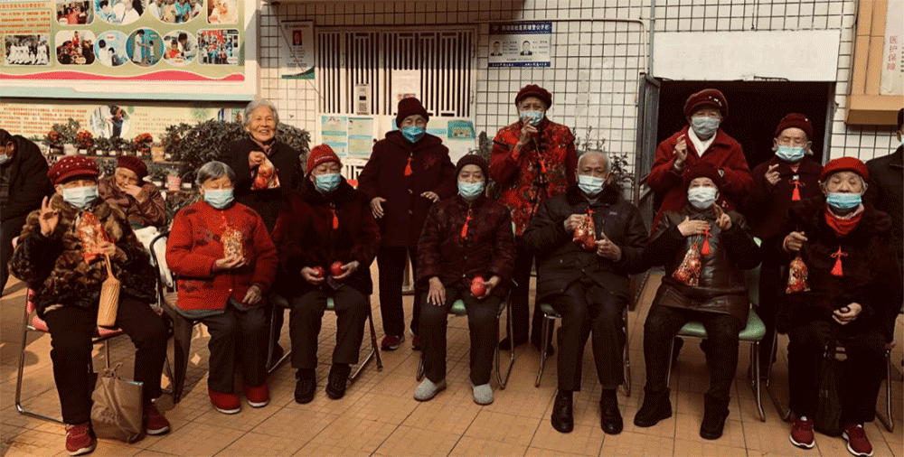 活动分为击鼓传花拜新年、抽号赠礼拜新年二大环节。第一环节,由中心少儿向老人拜新年。社工引导长者相互间保持一手臂的距离围坐成圈,每人发一张写有序号的卡片。随后进行击鼓传花,当鼓点终止,中心少儿为手持花束的老人送上他们自制的手工作品“吉祥结”给老人拜新年送祝福。老人亦会以“压岁钱”来表达对孩子的怜爱、感谢和祝福。