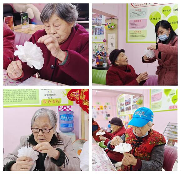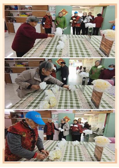 长者们认真制作菊花,寄托哀思
