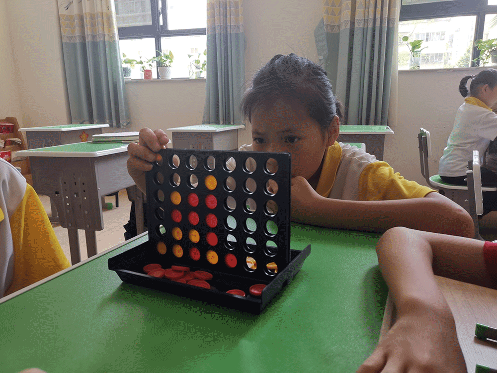 智力游戏课程紧张又愉快,每一次先按照能力分组,然后根据规则进行游戏,大家玩得不亦乐乎。从最开始的生疏、慢慢总结经验,到后面的熟练,孩子们的进步非常明显。儿童小娟特别没自信,和小伙伴玩了一会儿就气馁,觉得同伴太厉害,自己获胜几率小,不愿意继续玩耍。老师耐心安慰,教导她不能只看到别人的成功,只要自己在做游戏的过程中努力了,每次取得进步也是一种成功。在老师的鼓励下,小娟重新加入到游戏队伍,通过不断努力后,最终取得了几次胜利。