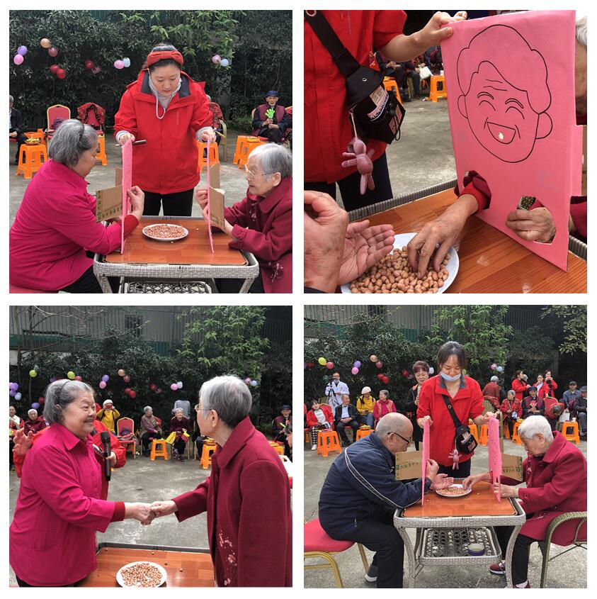 此次联欢活动别开生面,“水果派”趣味游戏拉开了活动序幕,十位爷爷奶奶戴上可爱的水果纸帽,按照新院区和老院区分成两组。主持人念水果名称,对应名称的长者需立即拍手,否则将被淘汰,以淘汰后剩余人数决定胜负。游戏既充满乐趣,又锻炼长者的反应力和注意力,爷爷奶奶全神贯注,玩得兴高采烈,不时露出窘相和憨态,逗得大家哈哈大笑。随后开展了“我是大胃王”游戏,输者向赢者送上重阳节祝福,温馨的祝福拉近了长者间的距离,将幸福和美好送给了在场每一位长者。