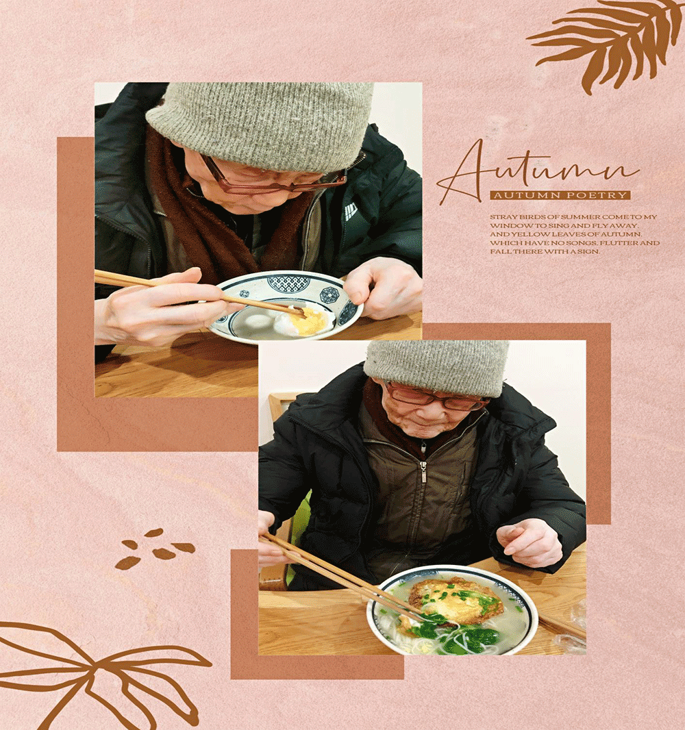 午餐时,工作人员提前与食堂师傅联系,为刘爷爷做了一碗热腾腾的鸡蛋长寿面,并送上生日祝福。刘爷爷一看挺高兴,乐呵呵地说:“哎呀,你们才好哟,麻烦了,谢谢哟!”不一会儿老人就吃完一碗面,他笑眯眯地说:“很合口味,这个生日太难忘了。”