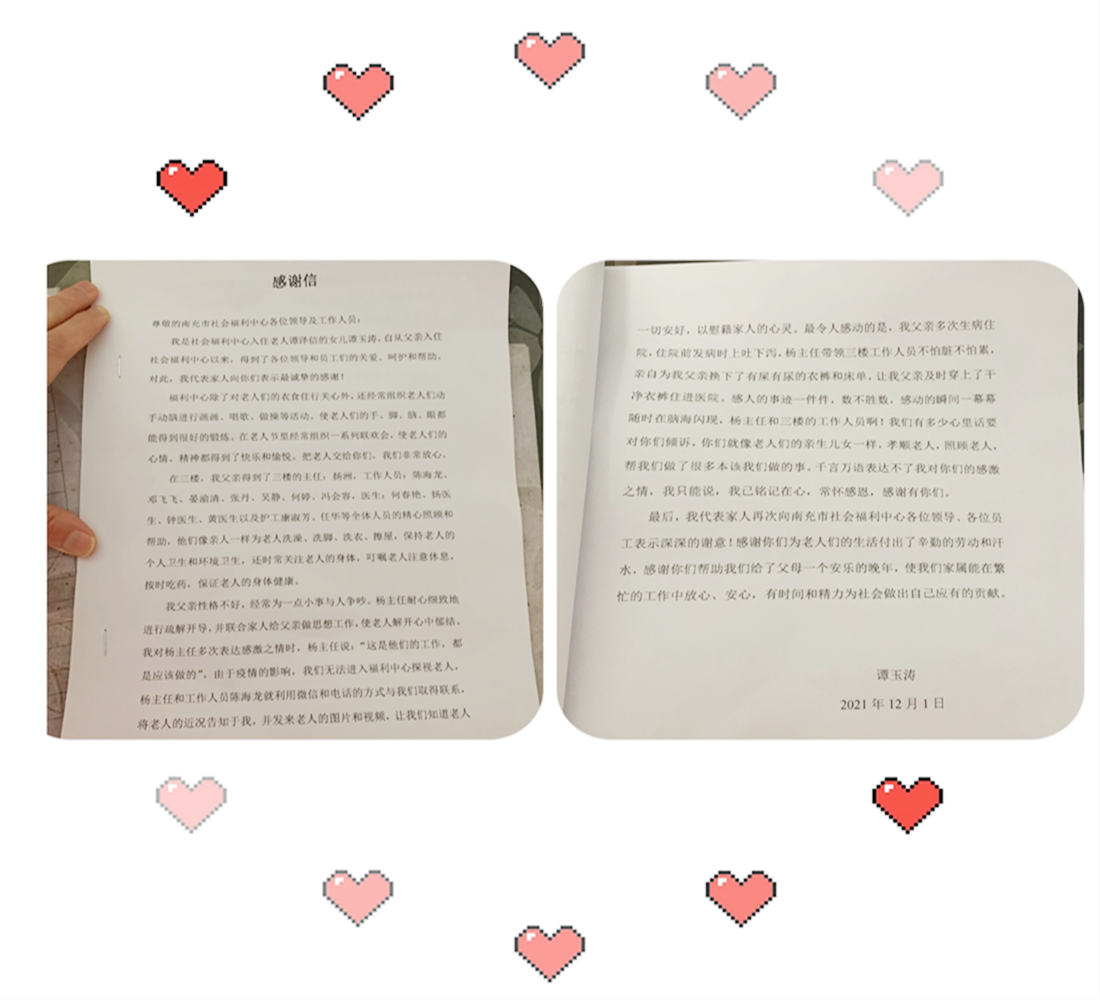 锦旗和感谢信让工作人员非常感动。科室负责人表示:“我们只是尽了自己的职责,但老人和家属却将我们的点滴关怀铭记在心,对我们工作给予充分认可。养老工作需要温度和情怀,我们更要以高度的责任和使命感,发挥最大的光和热,为老人提供更优质的服务!”