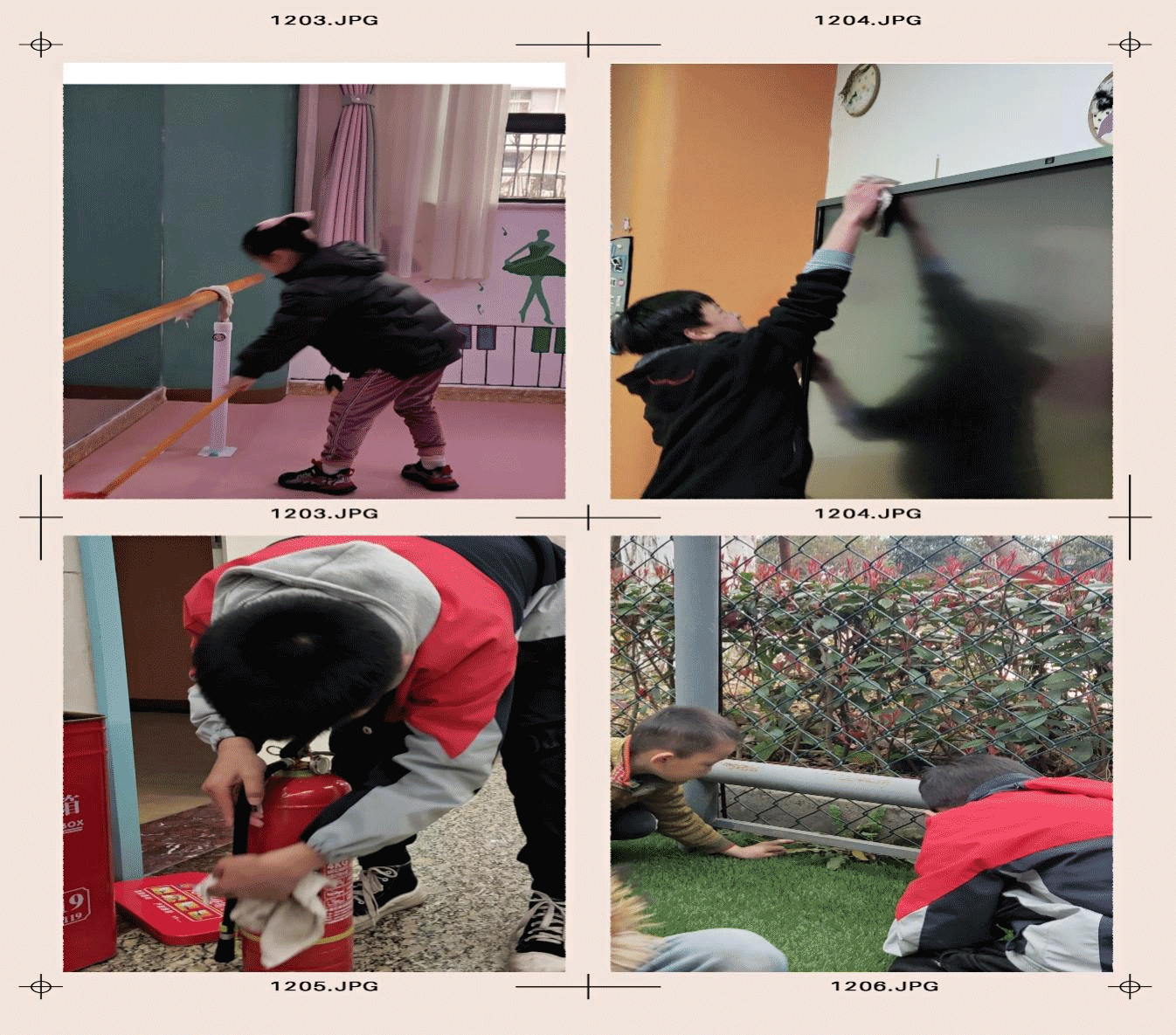 福娃们拿起扫帚、抹布等工具,有的清扫室内地面,有的负责花园道路,有的拾捡操场及花草丛中的废纸杂物。大家团结协作,不怕脏、不叫累,经过辛勤劳动,我们共同生活的家园变得更加整洁美丽。