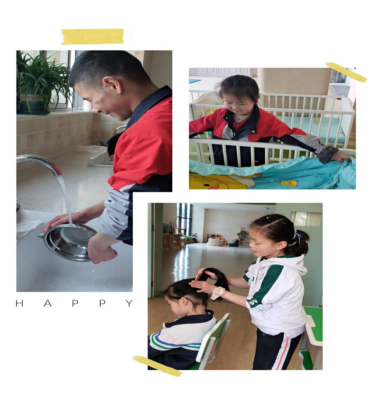 哥哥姐姐带领弟弟妹妹清洗自己的鞋袜、内衣裤,帮助妈妈们洗碗、整理床铺,帮助妹妹梳头发、编辫子,辅导弟弟妹妹的作业,勇当妈妈的好帮手。