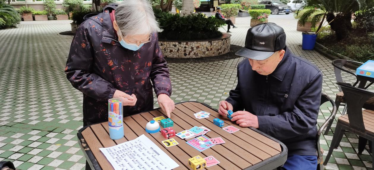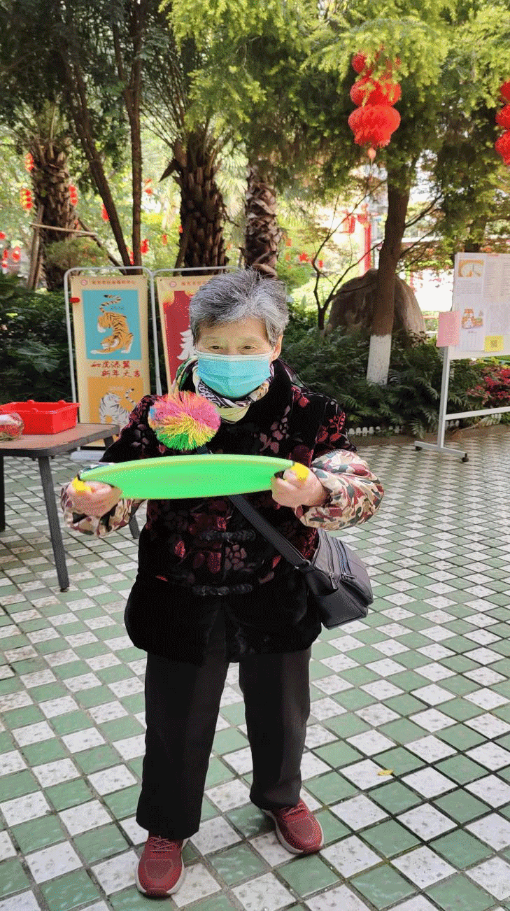 在院坝,投球游戏、弹弹圈、大象套圈、剪纸、变脸魔方等趣味项目让长者应接不暇,种类丰富的游戏道具增加了参与性和互动性,长者不知不觉就达到了一天的运动量。