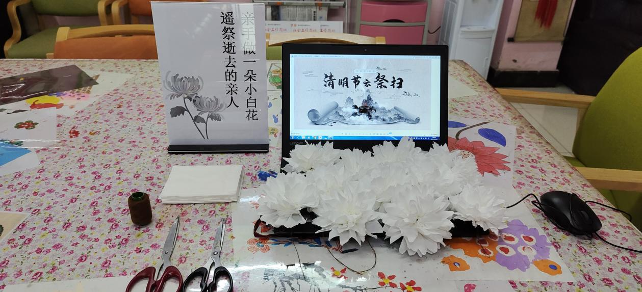 清明源自上古时代的祖先信仰与春祭礼俗,兼具自然和人文两大内涵,扫墓祭祖与踏青郊游是清明节的两大主题。由于目前疫情防控形势严峻,我中心入住长者无法亲自前去扫墓祭祀。为了让长者遥祭哀思,单位提供了为期一天的“自制小白花云祭扫”活动,倡导以简约的方式缅怀逝去亲人。