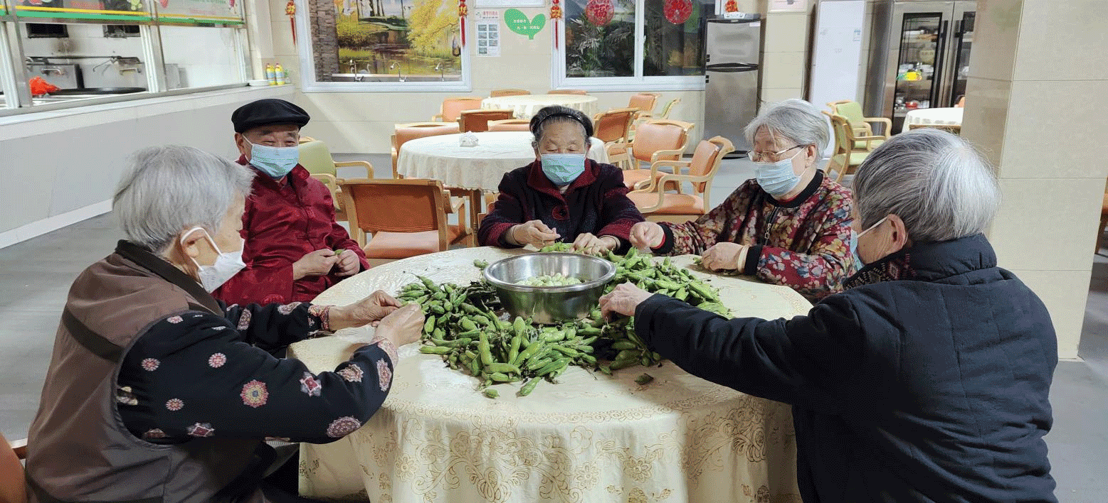 上午8点半,长者陆陆续续走出房间,有的到活动室参加音乐小组活动,有的到食堂帮忙剥胡豆,有的到花园锻炼身体。