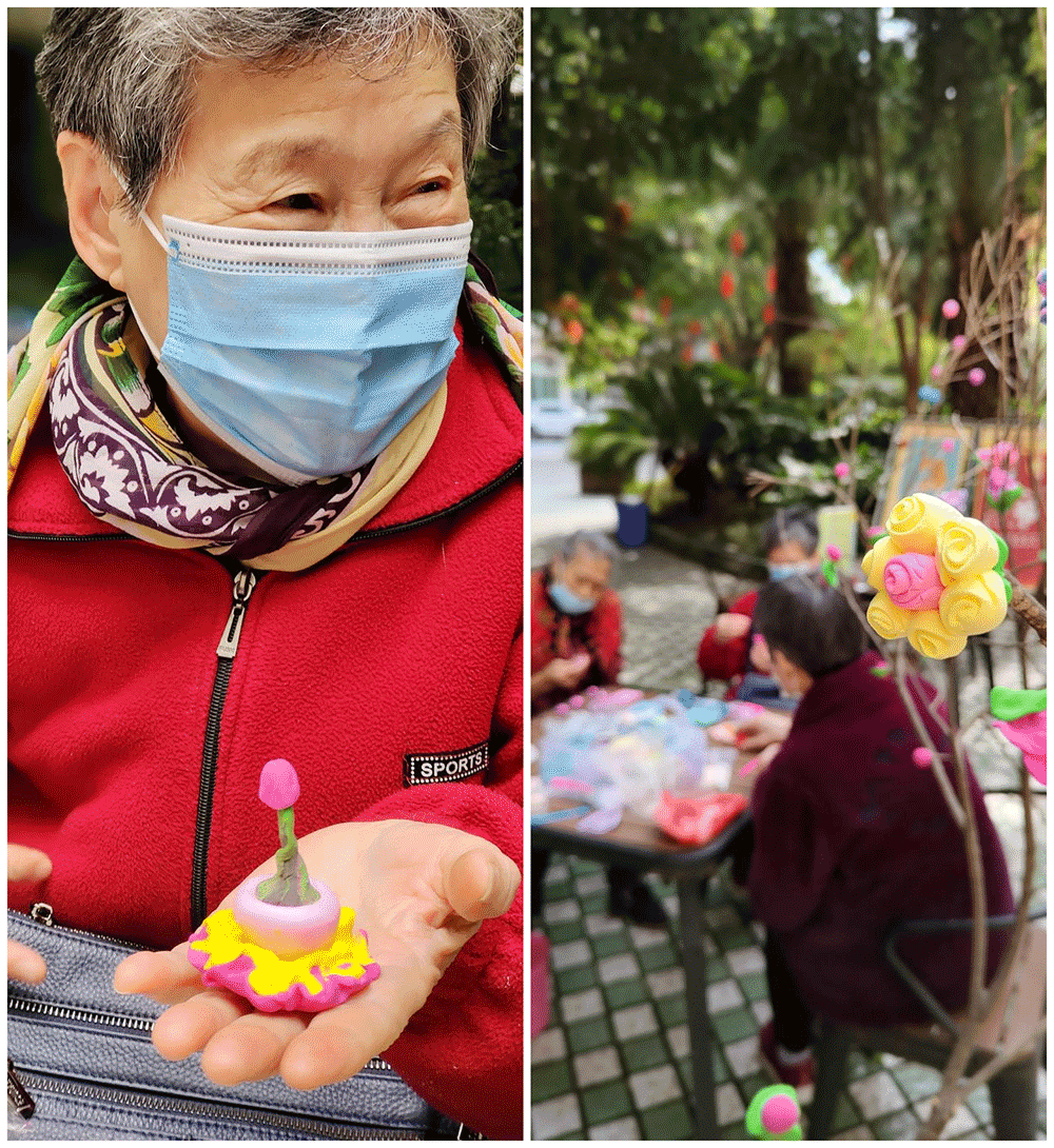 下午,工作人员为长者准备了粘土工具,供他们闲坐之余进行手脑活动,爷爷奶奶们创作了各式各样的粘土花,将一条条枯枝打扮得生机勃勃。