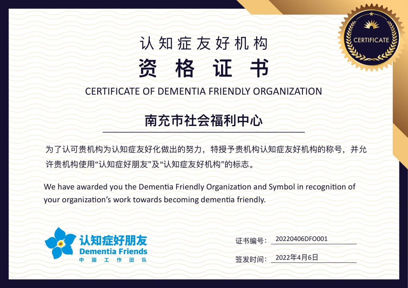2022年4月,认知症好朋友中国工作团队授予我中心“认知症友好机构”称号,同时授予中心老年社工周宇“认知症友好使者”称号,以认可我中心在推动认知症友好化方面做出的努力。目前,全省获“认知症友好机构”称号的机构仅3家。