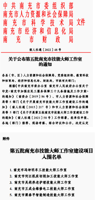 近日,市人力资源和社会保障局等五部门印发《关于公布第五批南充市技能大师工作室的通知》(南人社通〔〔2022〕48号),经单位申报、市民政局推荐、现场考察、综合评议等层层遴选,我中心“南充市吴莉养老护理技能大师工作室”入围南充市技能大师工作室建设项目。