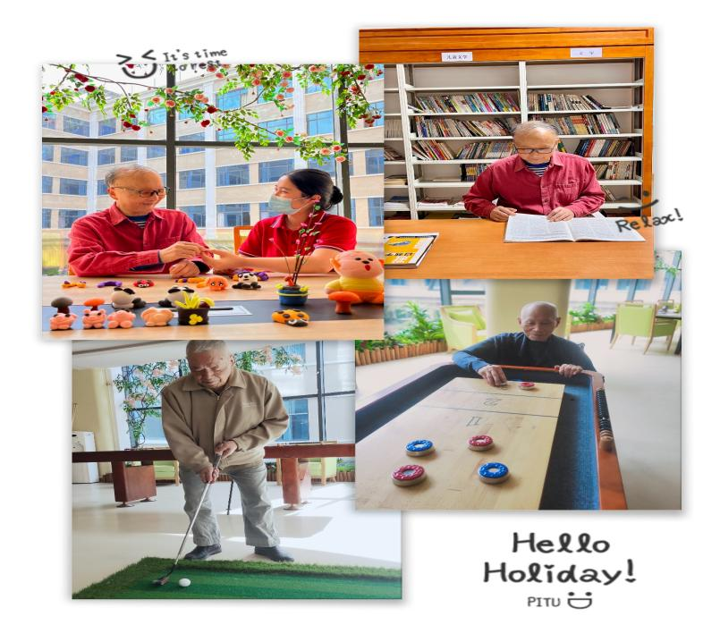 喜欢琴棋书画的爷爷奶奶可以在书画室练字绘画,在阅览室读书看报。喜欢打麻将的老人找好麻将搭子,搓上几盘,半下午的时间就过去了。有桌球爱好的老人可以挥几杆。各种类型的手工活动也是老人们的爱好之一。还有高尔夫、桌上冰壶这些老人以前没怎么接触过的新活动,在工作人员的指引下,老人也产生了浓厚的兴趣。
