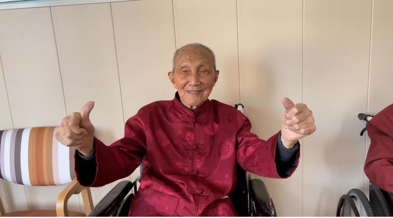 拍摄现场,百岁老人周湘生对着工作人员竖起了大拇指,还笑着说道:“相信祖国相信党,接种疫苗保健康!”