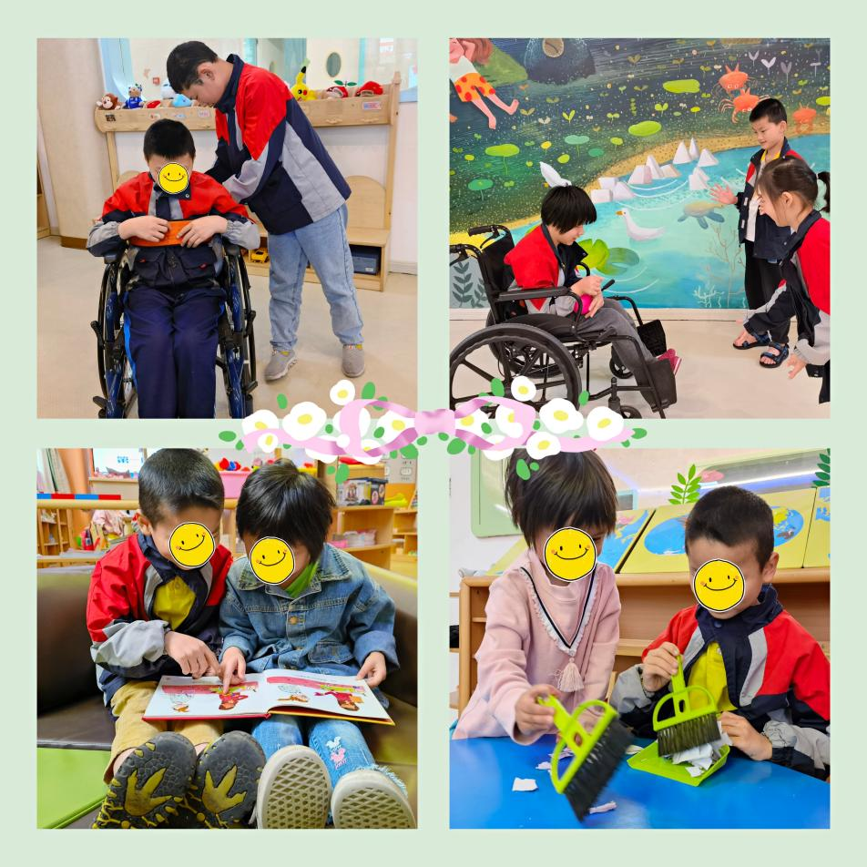 课后,孩子们纷纷将所学知识付诸行动,帮助同学系轮椅安全保护带,和同学玩互动游戏——抛球,一起阅读绘本故事,一起提升生活技能。