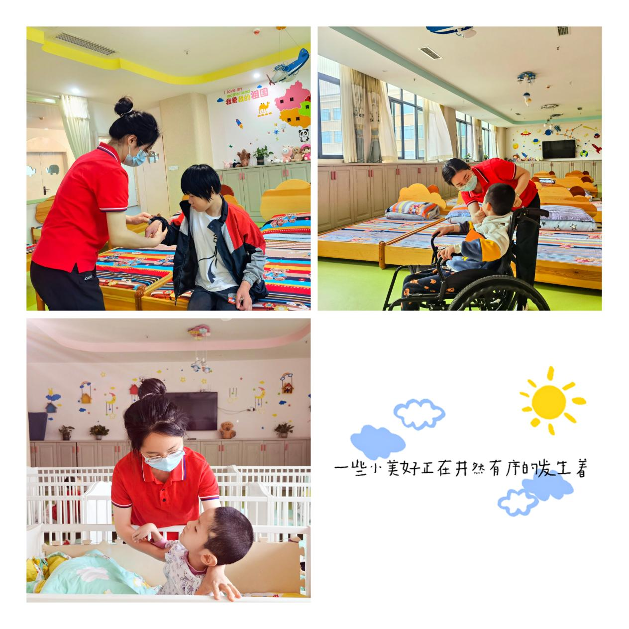 护理员妈妈每日不辞辛劳地为残疾儿童穿衣、洗漱、喂饭,改善他们的生活环境,提升生活质量,给残疾儿童营造温馨和谐的生活环境。