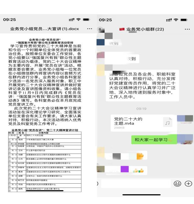 业务党小组及时制定活动计划,以两种方式开展“党员在讲”活动。一是每位党员在小组微信群内将宣讲内容以音频方式在群内进行分享。二是各业务科室至少选派一名党员深入服务对象和职工开展党的二十大会议精神宣讲,并做好宣讲记录和宣讲图像资料收集,实现本月底完成宣讲工作。