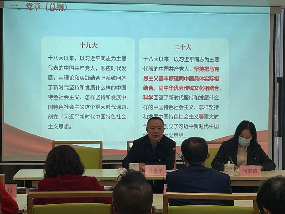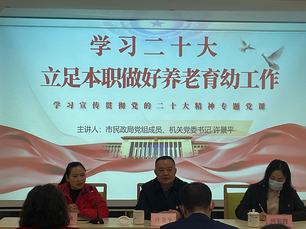 许景平紧紧围绕“学习二十大 立足本职做好养老育幼工作”主题,从“党的二十大对党章的修正”“党的二十大”“民政工作这十年”“立足本职做好养老育幼工作”四个方面出发,将理论与实际相结合,为全体党员上了一堂生动精彩的党课,对全体党员深入学习领会党的二十大精神起到了很好的指导作用。他强调要立足本职做好养老育幼工作:一要全面深入学习领会党的二十大精神,谋划推进工作;二要深刻领会坚持党的全面领导和全面从严治党的重大部署,厚植为民情怀;三要始终把人民放在心中最高位置,践行为民初心。