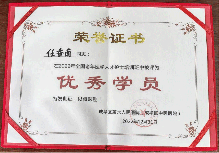 结业考核后,在41名学员中评选三名优秀学员,我中心护士任香南成为其中之一,获“优秀学员”荣誉证书。