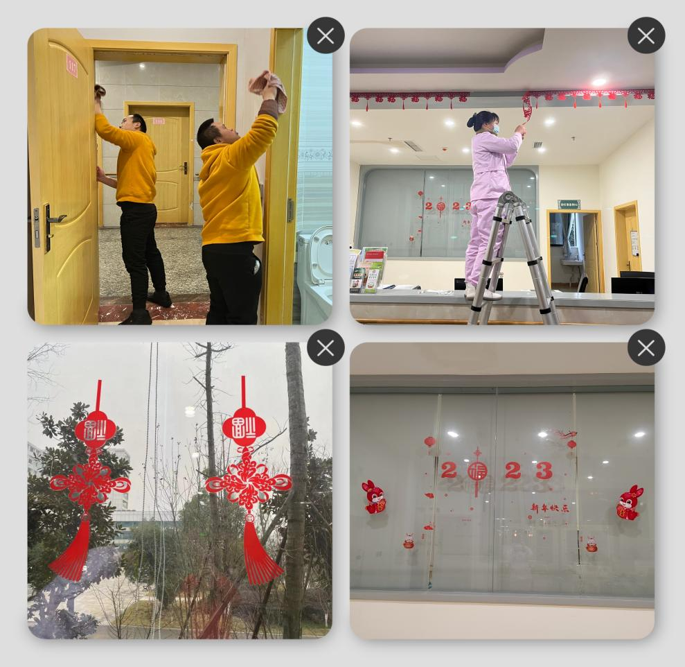 住院部的工作人员利用休息时间,带领科室特困人员一起整理科室清洁卫生,增添新春佳节喜庆元素。护士站是一个病区最为醒目的地方,大家发挥聪明才智,心灵手巧地将护士站装扮得十分温馨。病区走廊是患者和医务人员最常经过的地方,简捷明了的装饰既有氛围感又大方美观,其中门联和窗花是必不可少的装饰,别出心裁、独具创意的饰品受到大家的称赞。