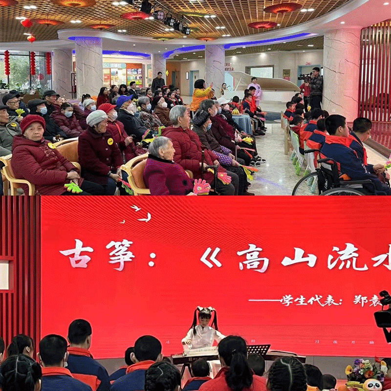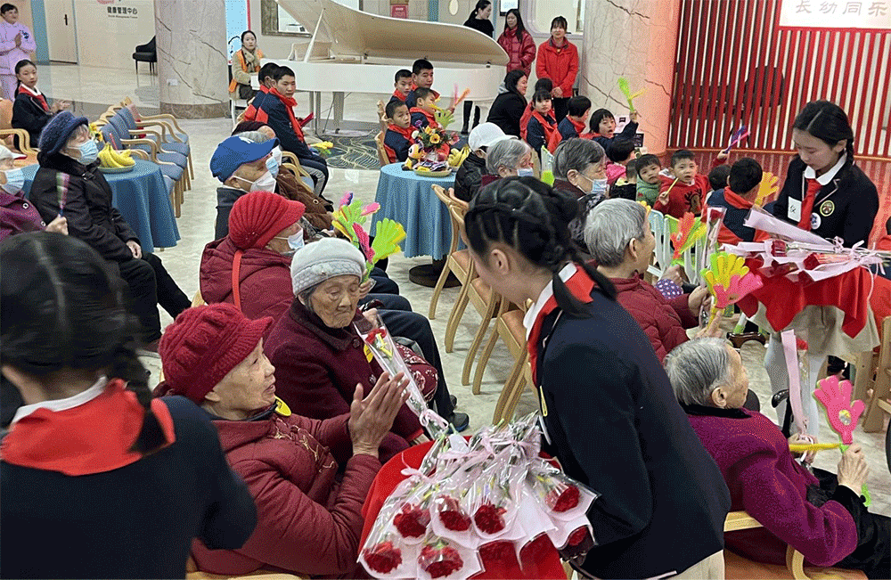 多才多艺的学生为老人准备了舞蹈、古筝、朗诵和互动小游戏等精彩表演。学生的表演不仅为活动增光添彩,更温暖了老人们的心。表演结束后,石油南路小学为我中心的老人送上慰问品、鲜花等,表达师生对老人们的关爱。学生将精心包装的鲜花和小礼物逐一送到爷爷奶奶手上,老人们看见天真可爱的孩子们喜悦不已,每个人脸上都乐开了花,现场萦绕着春日的暖阳,场面温馨感人。