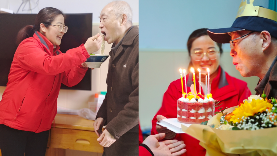 伴随着欢乐的生日歌,工作人员手捧鲜花和蛋糕缓缓走入王爷爷房间来到他的面前。烛光交映下,王爷爷露出了幸福的笑容,科室负责人喻小莉为爷爷送上一碗长寿面,祝王爷爷长寿又安康!