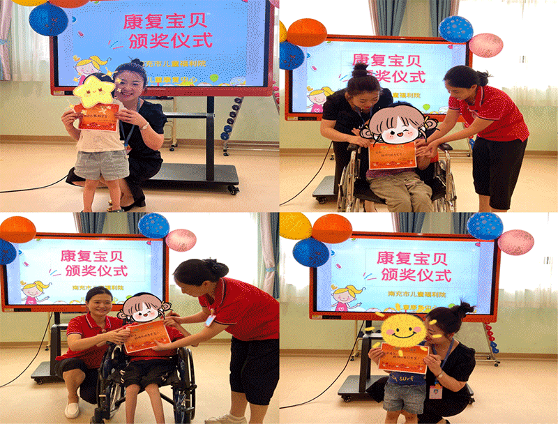 通过累积约千余节的康复训练,部分儿童的运动功能、言语功能和生活自理能力均获得显著提升,将进入院内特教班就读。颁奖仪式上,康复师为“阳光宝宝、最佳进步宝宝、学习宝宝”等获奖儿童播放了康复之路和成效展示,康复师见证了孩子成长的喜悦。副主任柯亚妮向获奖的康复儿童颁发了奖状,送上祝福。随后,康复师组织儿童进行了抢凳子和切西瓜等游戏,孩子们玩得十分高兴。