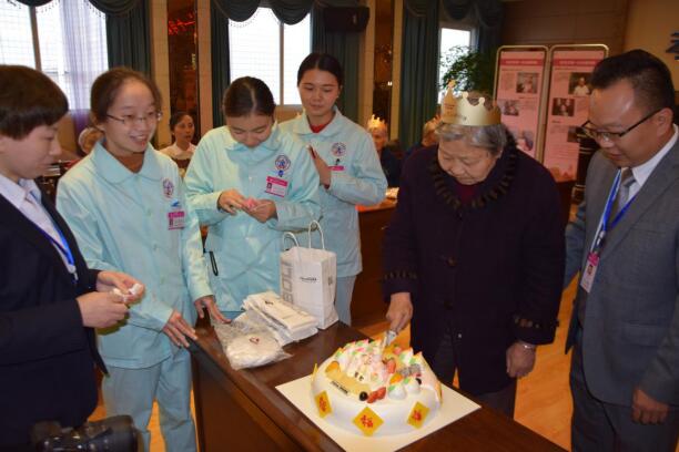 工作人员协助老人切下生日蛋糕