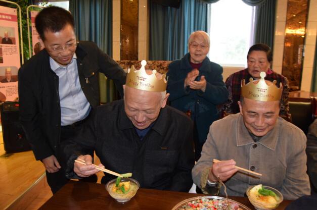 寿星们品尝着爱心长寿面