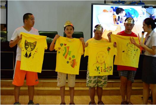 接下来的环节是养护区工作人员的诗歌朗诵,正如诗歌所诵的那样“放下你自卑的念头,仰起你自信的面孔,用你的真诚和努力,面对生活的挑战,谱写人生的新篇章。”工作人员一直用心呵护这群特殊的“孩子”,竭力帮助他们重拾对生活的信心。我院的老年合唱团也用充满激情的歌声向特困人员送上祝福。但是惊喜远远不止这些,随着音乐声响起,工作人员将事先精心绘制的T恤送到寿星手中,“狮子、大树、彩虹、雨滴……”绘制的图案各种各样,一共12件,每一件T恤上都有他们的名字。芳草(化名)拿着衣服,开心地说:“能收到这个礼物,真的很感动。谢谢姐姐们。”简单、朴实的话语传达出他们此时此刻激动的心情。