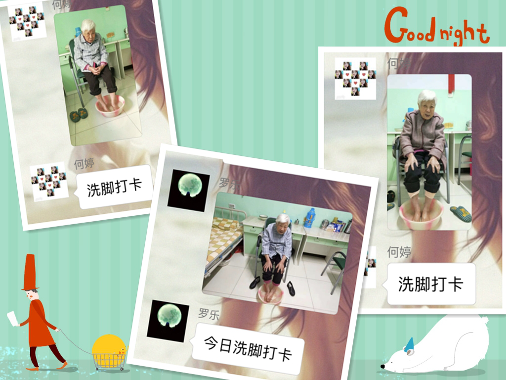 生活在特护区的沈婆婆身板瘦小但性格固执,对于洗脚一事,她总有一套说词:“我一会儿自己洗、我昨天才洗过、我睡觉前洗”,待工作人员按约定时间为她洗脚时,“精明”的沈婆婆早已躺床上睡觉。面对倔强的沈婆婆不爱洗脚的习惯,特护区工作人员启动了打卡式服务,提前告知沈婆婆每天洗脚都要拍照片发给她最爱的小女儿,婆婆听说小女儿知道自己拒绝洗脚的事,态度发生180度转变,虽不主动提出洗脚,但不再找理由拒绝工作人员为自己洗脚,所拍照片表情也由原来的瞪眼、不看你、撇嘴转变为现在的右手比划“耶”手势。在特护区的微信工作群,每天晚饭前总会看到沈婆婆的洗脚“打卡”照。