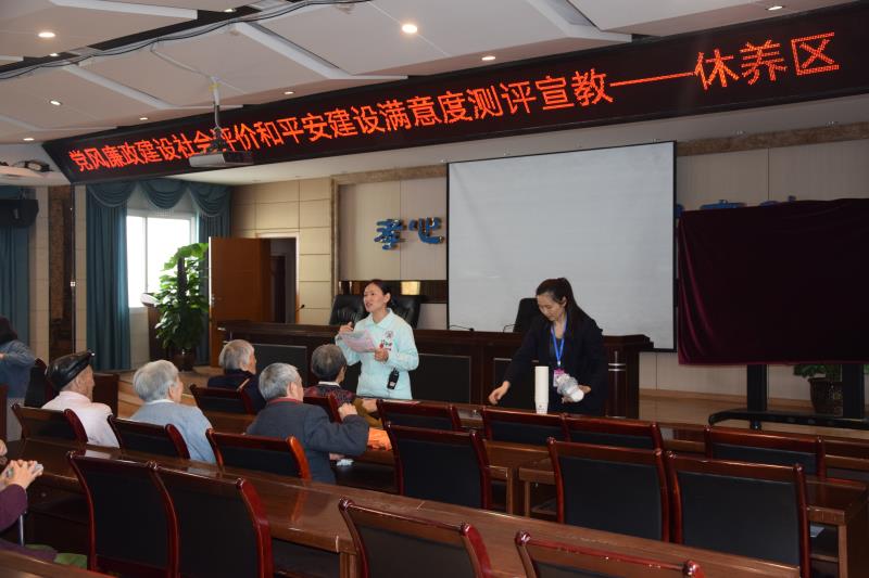 为让老人充分了解党风廉政建设评价调查的新变化,保障老人合法权利,休养区工作人员采取多种形式在该区老人及家属中广泛开展党风廉政建设社会评价和平安建设满意度调查的宣教活动。