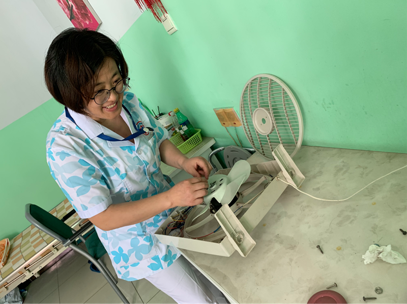 特护区的老人身体弱,在炎热的夏季使用空调不利于身体健康,为此,科室早早准备好了电风扇。6月13日,科室主任喻小莉组织科室成员排查风扇使用情况,不能正常使用的风扇及时报修,不能维修的风扇报废处理。由于601房间风扇进行了报废处理,喻主任便把公家的小型立扇拿出来暂时给老人使用,从风扇的拆洗到安装、检查风扇的性能和安全性,她都亲力亲为,一整套动作十分麻利,犹如行云流水。看到这一幕,我内心感慨万分,喻主任以身作则,将老人的健康、安全、舒适放在首位,我们更应该以此为榜样,想老人之所想,急老人之所急。