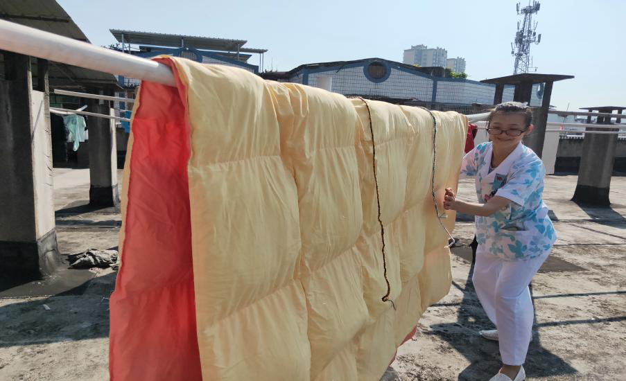 随着气温逐步升高,传说中的“秋老虎”来临,酷暑让人无奈,但也是晒被褥的好时节。养护区工作人员挨户通知老人,并统计好被褥数量以便及时进行晾晒。
