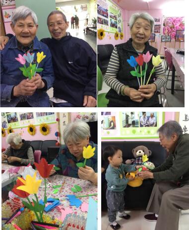 今日的节日文化活动是以“幸福像花儿一样”为主题的手工制作。在工作人员的讲解示范下,老人、儿童兴致勃勃,画的画、剪的剪,折的折,最终将一张张毫无生气的卡纸变成了娇艳欲滴的鲜花。看着自制的花朵,老人们或自行珍藏,或赠于孩童,或夫妻互赠。花好月圆,朵朵小花绽放出老人晚年生活的多姿多彩、幸福甜蜜,绽放出孩子的天真烂漫、阳光可爱。