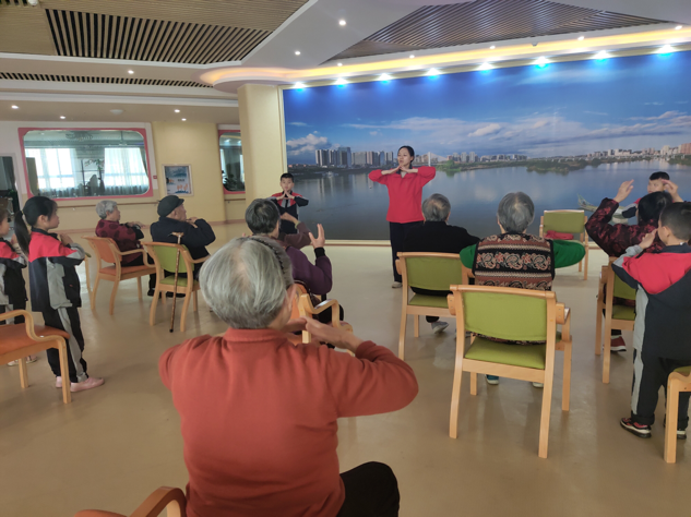 工作人员韩思娟向老人和孩子讲解了党诞生的历史背景以及党旗和党徽所蕴含的意义。随后,她带领老人和孩子学习手势舞——《名字叫中国》,老年人和孩子热情投入其中,跟随节奏认真比划动作,整个活动大厅洋溢着欢快的气氛。活动过程中,老人和孩子相互交流,互帮互学,深情传唱,用手势舞表达自己对党和国家的祝福,向建党100周年献礼!
