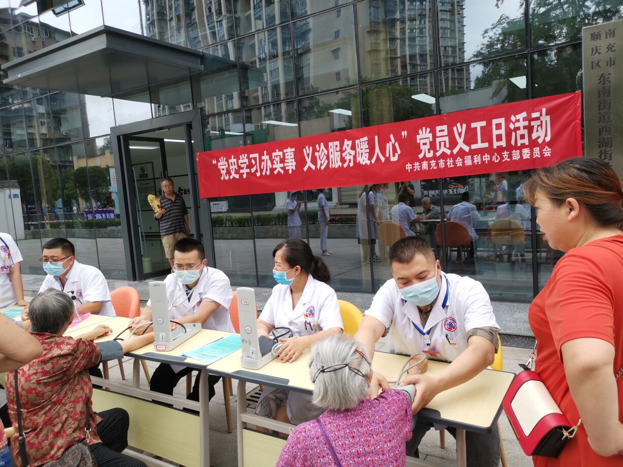 为迎接中国共产党成立100周年,深入推进党史学习教育,扎实开展“我为群众办实事”实践活动,提升社区居民健康保健意识,倡导科学、文明、健康的生活方式,6月27日上午,南充市社会福利中心党支部前往西湖街社区开展了以“党史学习办实事, 义诊服务暖人心”为主题的义诊志愿服务活动。