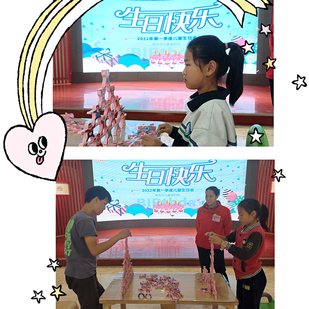 小游戏兼具竞技性、趣味性,既为生日会增添乐趣又能增强儿童的互动,有助于培养团队精神。孩子们都积极参与,乐在其中。游戏“动物园里有什么”激起了大家的头脑风暴,两队不相上下。在脑筋急转弯游戏中,红队反应最快,连续答对3题。儿童小昊在堆堆塔游戏中表现突出,堆塔时十分冷静,平稳地堆放每一块人形积木,最终叠了10层。