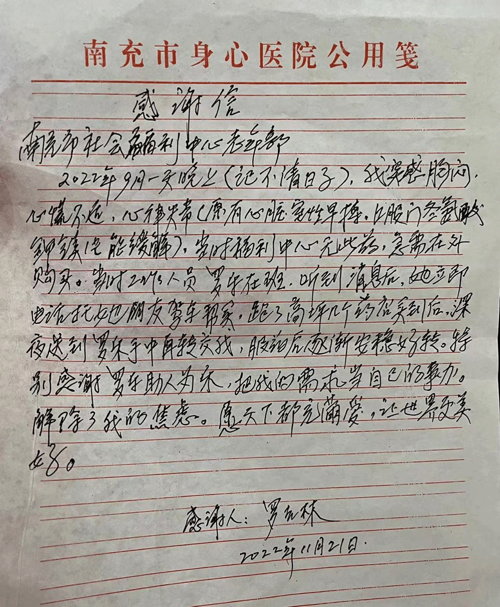 11月21号的下午,我中心新院区老年部工作人员收到两封来自住养老人罗吉林的感谢信。