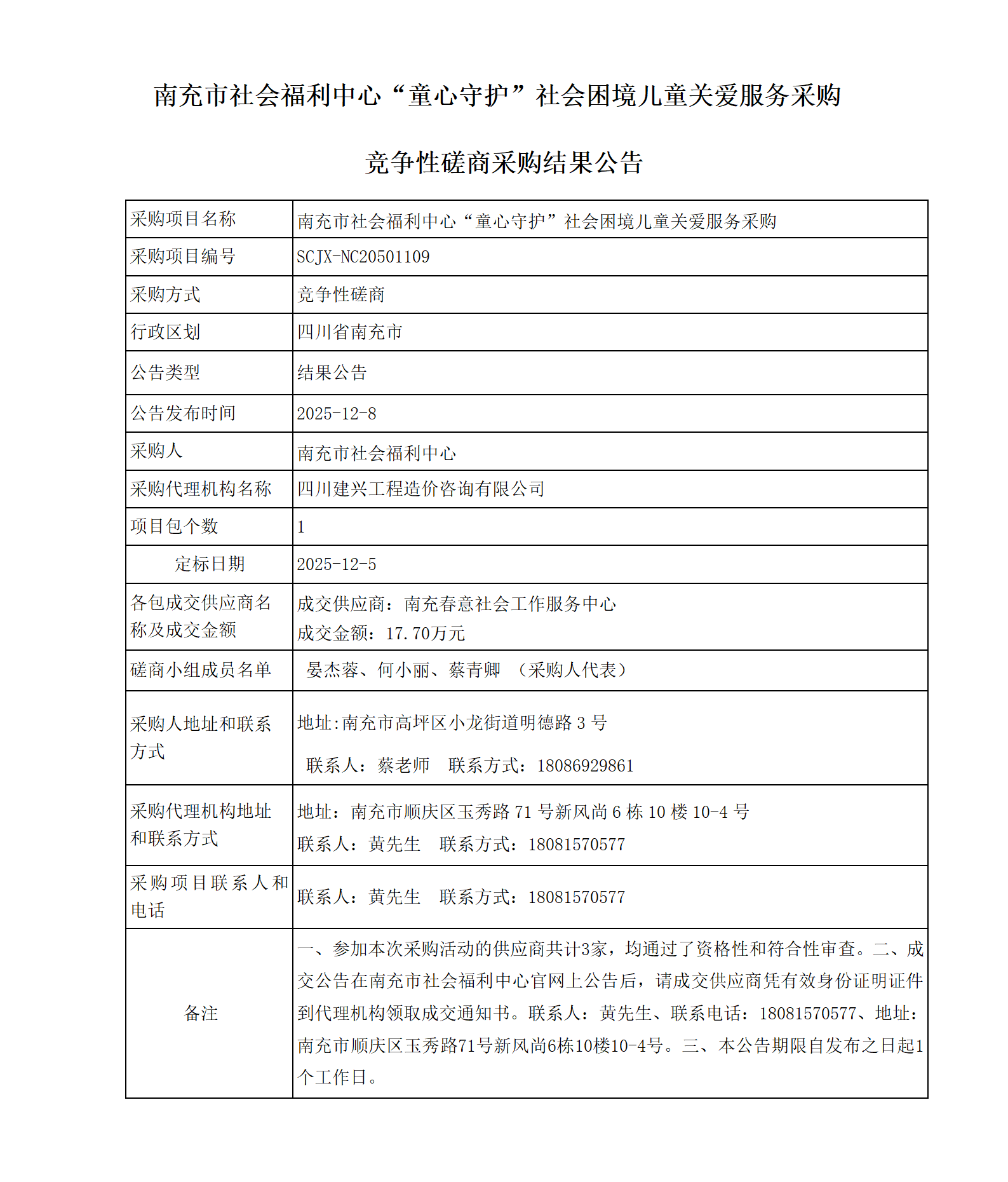 南充市社会福利中心“童心守护”社会困境儿童关爱服务采购竞争性磋商采购结果公告